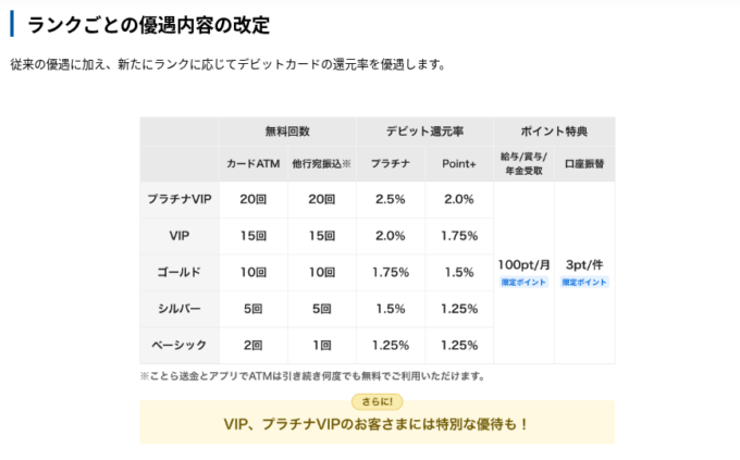 ランクに応じた振込手数料無料の回数とATM利用手数料の無料回数が決められています。