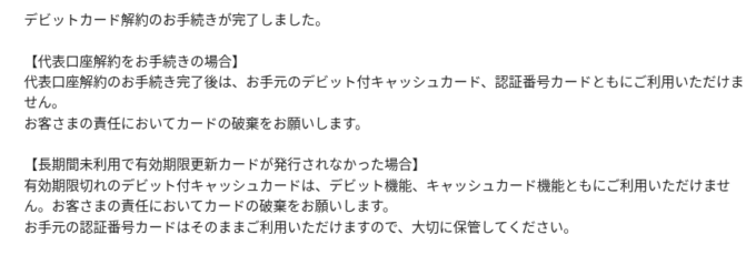 無事にデビットカードの解約手続きが自動的に行われたようです。