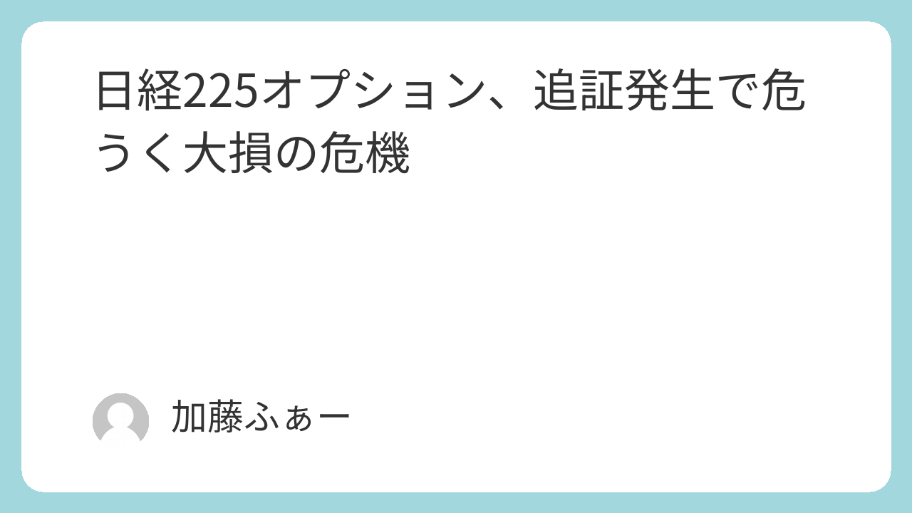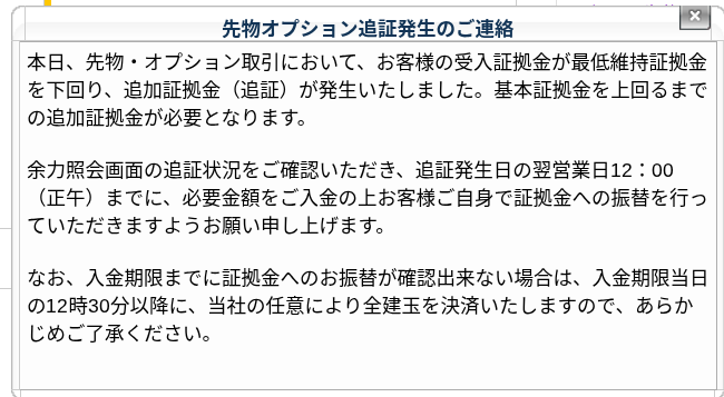 日経先物や日経225オプションなどの証拠金取引において破綻するのは、実損が出てというより追証が払えずに強制決済されてのことだということを実感しました。