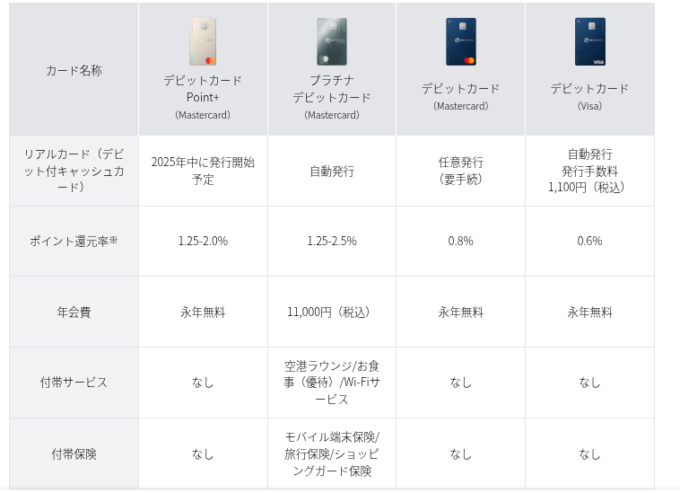 - 住信SBIネット銀行では、デビット付きキャッシュカードしか発行されない