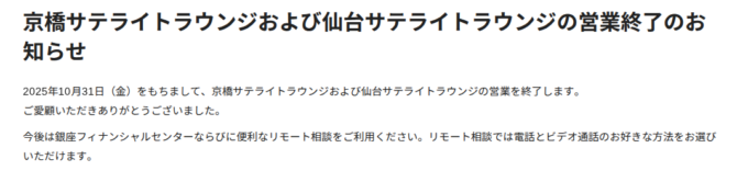 2025年10月、SBI新生銀行がサテライトラウンジを閉鎖して仙台から完全に撤退しました。