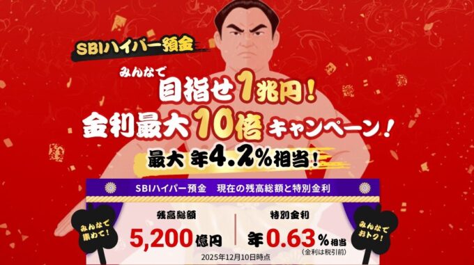 SBI新生銀行ではSBIハイパー預金の金利を預金量に応じて最大で年4.2%相当まで引き上げるというキャンペーンを12月10日から開始しました。