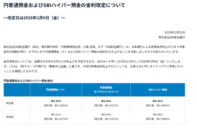 2025年12月の日銀の政策金利引き上げをうけて、SBI新生銀行が預金金利の引き上げを予告しています。