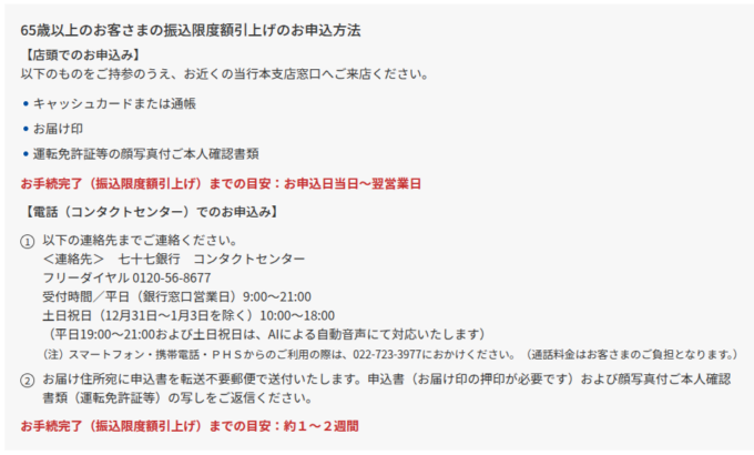 65歳以上のお客さまが振込限度額を引上げする場合は、店頭または電話(コンタクトセンター)でのお申込みが必要です。